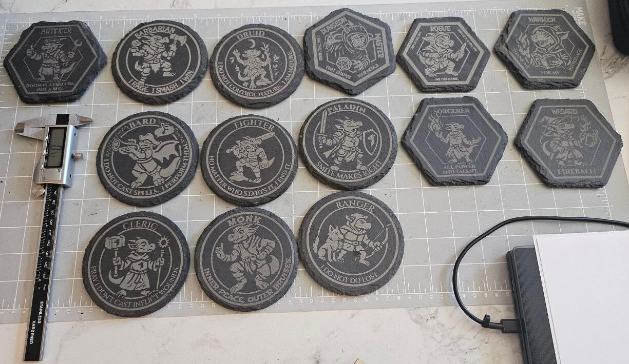 NEW! Now that Kobolds have lasers (a great idea), we now can make laser etched slates! We recently brought all of the D&D classes as Kobolds would play them on slates -- and now on sale in our Etsy store.We can also do this as custom work at conventions and in orders (the laser is portable and runs either in the Den/Alley or in the room), just contact us for a quote.